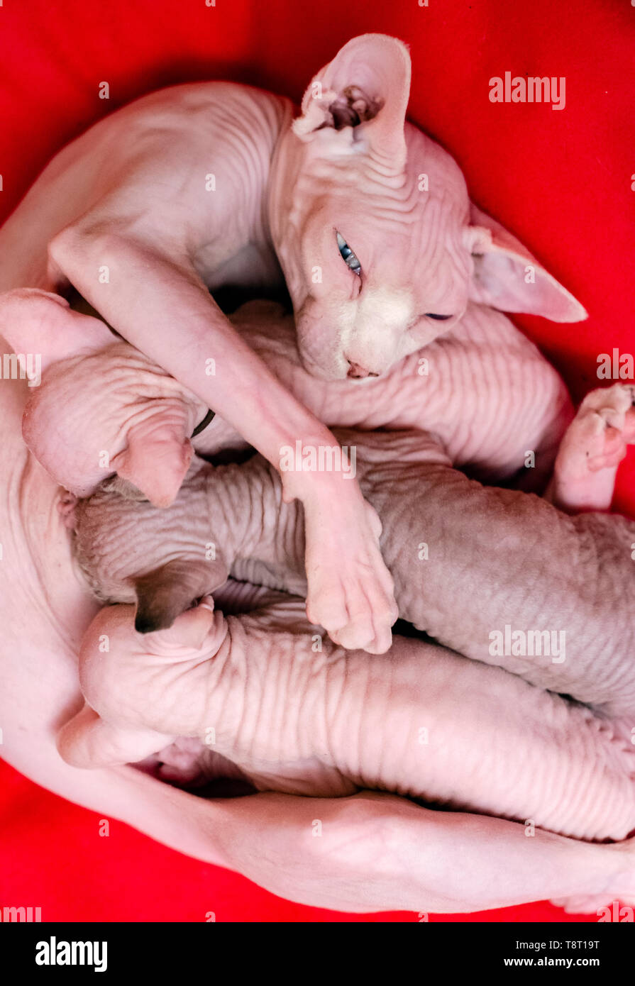 A Mother Sphinx Cat A Hairless Race Nursing Her Baby Kitten Stock Photo Alamy